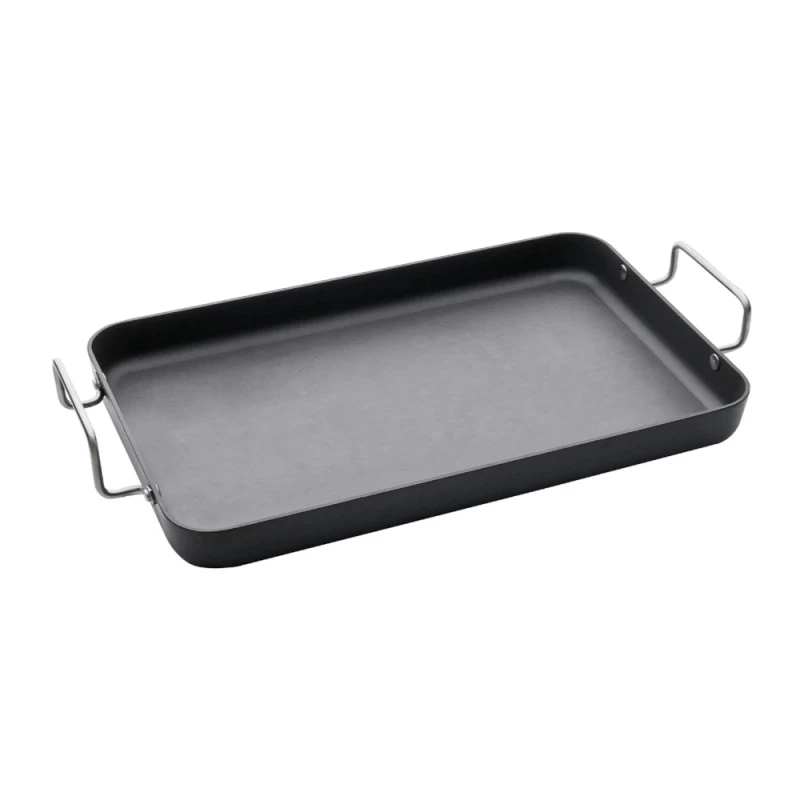 Robuste et durable, sa surface est durcie grâce à un processus d’anodisation, conférant ainsi une résistance accrue contre les éraflures, tandis que son intérieur antiadhésif simplifie à la fois la préparation des repas et le nettoyage ultérieur. Présente une grande surface de cuisson de 26,5 x 49 cm.