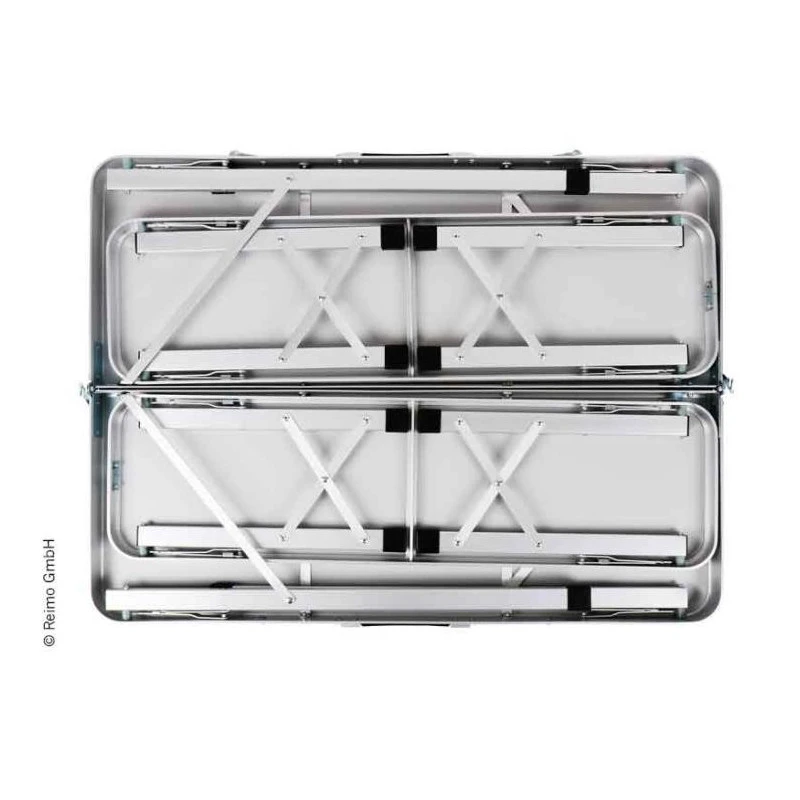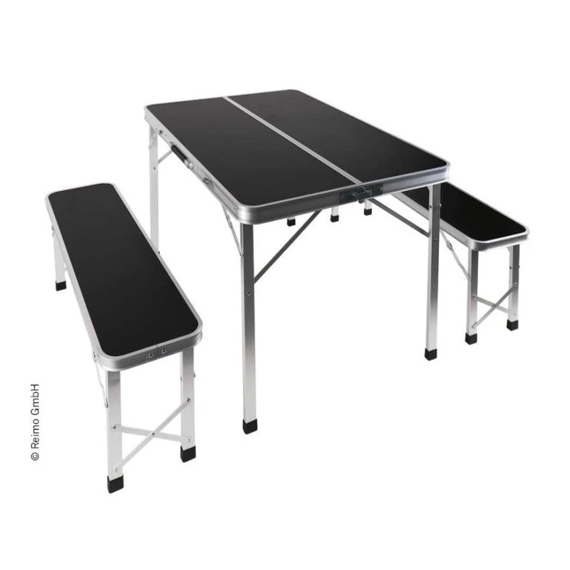 Table pliante de type valise de CAMP4 avec 2 bancs pliables amovibles intégrés dans la valise, pour vos pique-niques au camping, en weekend ou avec le camping-car, fourgon et van aménagé. Pour 4 personnes.