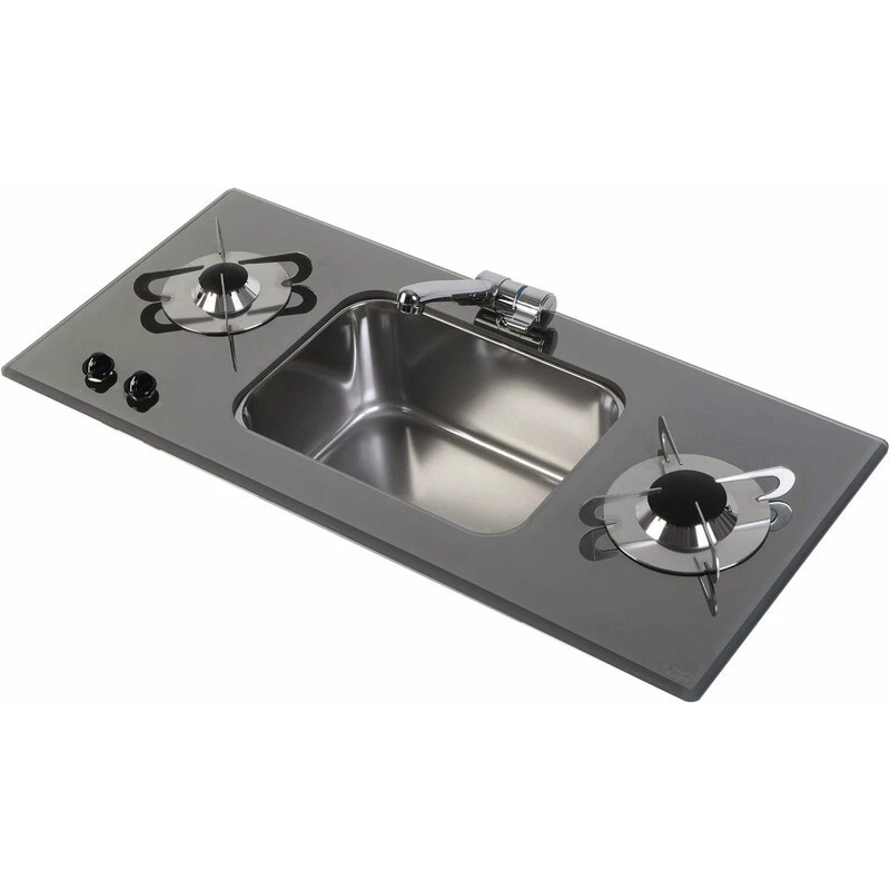Equipement de qualité, le combiné CAN offre un évier central parfaitement intégré au plan de travail verre traité anti rayures. A la fois esthétique et pratique, ce combiné deux feux gaz (2000 et 1100 W) est un accessoire de haute qualité qui trouve facilement sa place dans la cuisine de votre fourgon aménagé ou de votre bateau.