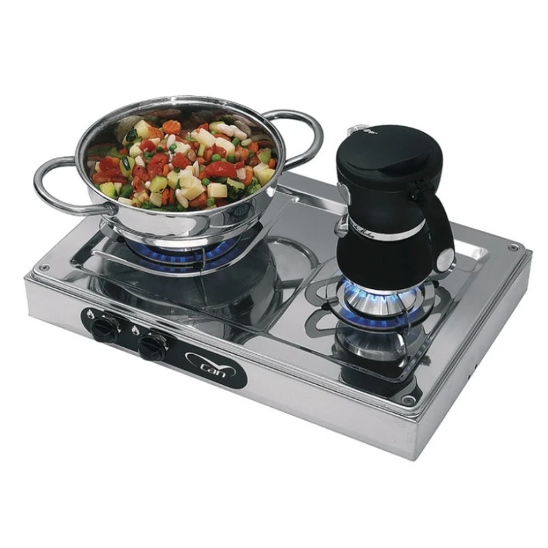 Conçu par la marque Italienne CAN spécialiste de l’inox et de la cuisson dans les bateaux, camping-cars et van, ce réchaud gaz offre donc 2 feux d’une puissance de 1900 W + 1000 W. Accessoire de qualité parfait pour les coins cuisine compacts, le réchaud est monté sur châssis inox pour une fixation posée sur le plan de travail. Parfait si vous n’avez pas la possibilité de poser un réchaud encastré.