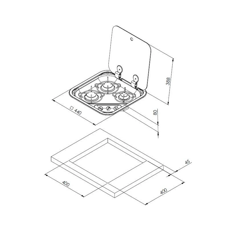 Le Hoodiny 3 feux rectangle de CAN est un plan de cuisson gaz fabriqué en inox avec un couvercle en verre trempé pour l’aménagement de votre van, fourgon aménagé ou bateau. Se pose par encastrement avec dimensions hors-tout de 450 x 450 mm.