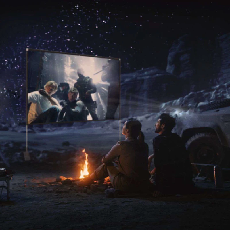 Il vous suffit de placer le projecteur sur un support, en face d’une surface de projection lisse et uniforme, que ce soit la carrosserie d’un camping-car ou un écran tendu. Ensuite, il vous suffit de le brancher à une source d’alimentation, comme une batterie nomade, par exemple. Une fois allumé, le vidéoprojecteur s’ajuste automatiquement, puis vous pouvez connecter votre ordinateur portable via un câble HDMI et profiter de vos films stockés sur celui-ci.