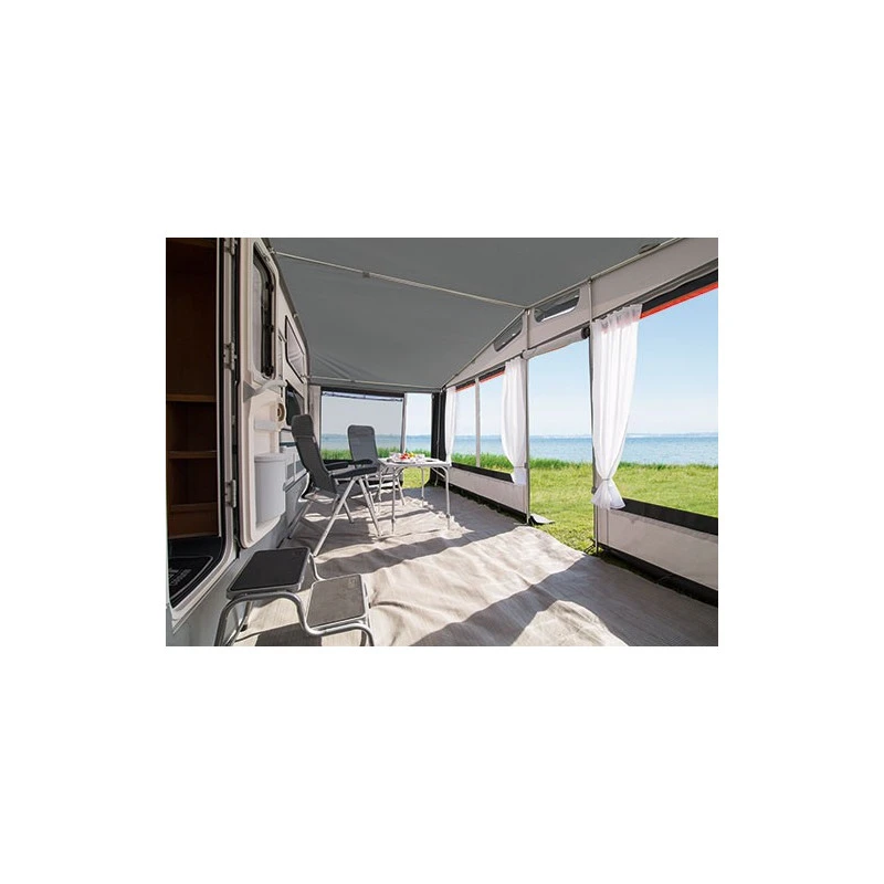 Cet auvent proposé dans les tons gris et blanc est destiné à un usage intensif peu importe la saison. Réalisé en toile polyester de haute qualité plastifiée sur les 2 côtés, cette toile est résistante au vent et au soleil. Les aérations peuvent être refermées et les rideaux peuvent être tirées au niveau des fenêtres pour préserver une certaine intimité lorsque vous vous trouvez sous votre auvent.