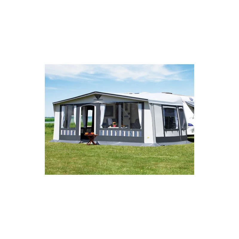 Auvent de caravane DWT toute saisons avec une belle profondeur de 300 cm tout en polyester avec une armature acier résistante aux intempéries.
