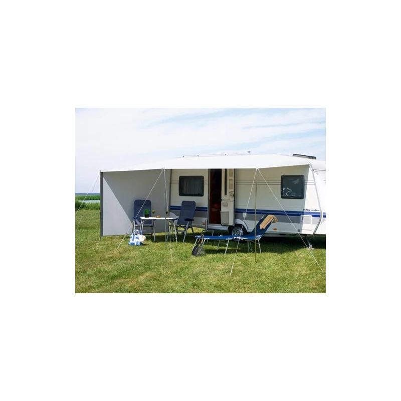 La toile solaire vient s’enfiler dans le rail de votre caravane pour ensuite venir y fixer une paroi latérale à gauche ou à droite selon le sens du vent. Une fois votre toile fixée, il vous suffit de mettre en place les piquets de maintien ainsi que le système de haubanage pour pouvoir maintenir votre solette tendue.