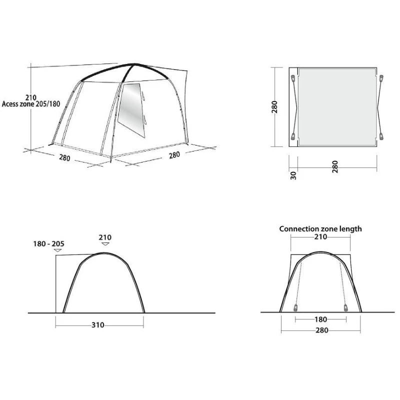 Par beau temps, cet équipement extérieur vous protégera du soleil et en cas de pluie il est fabriqué avec des coutures thermo-soudées qui seront un allié redoutable contre les infiltrations d’eau. Au-dessus de la grande porte avant, en face de la porte d’accès du véhicule, une ventilation résistant aux intempéries permet à l’air de circuler. Un tapis de sol amovible à barillet et une grande fenêtre latérale offrent des possibilités supplémentaires.