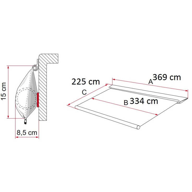 – Longueur de la toile : (B) : 334 cm