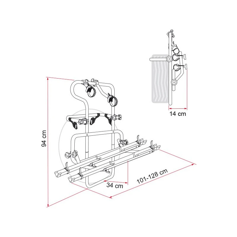 En standard, le porte-vélo FIAMMA est livré avec sangle Strip Red et barres de maintien Bike-Block Pro 1 et 3. Attention, si les feux et la plaque d’immatriculation du véhicule sont cachés par les vélos, prévoir une plaque amovilbe : voir ici.