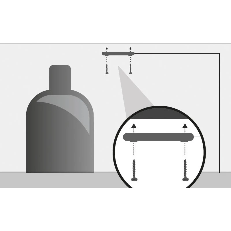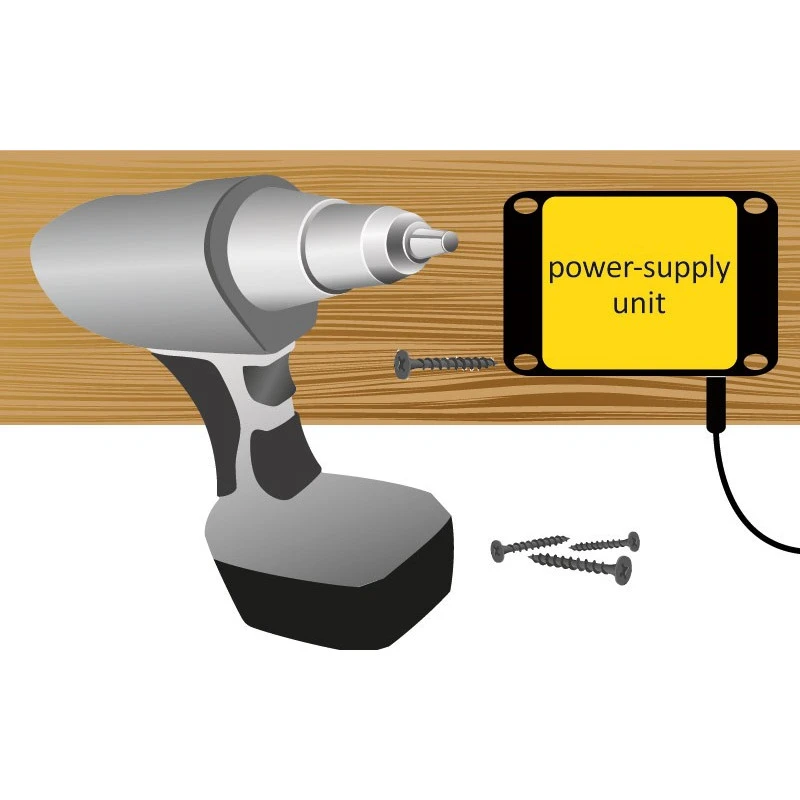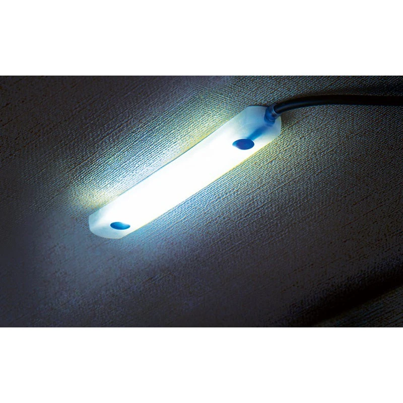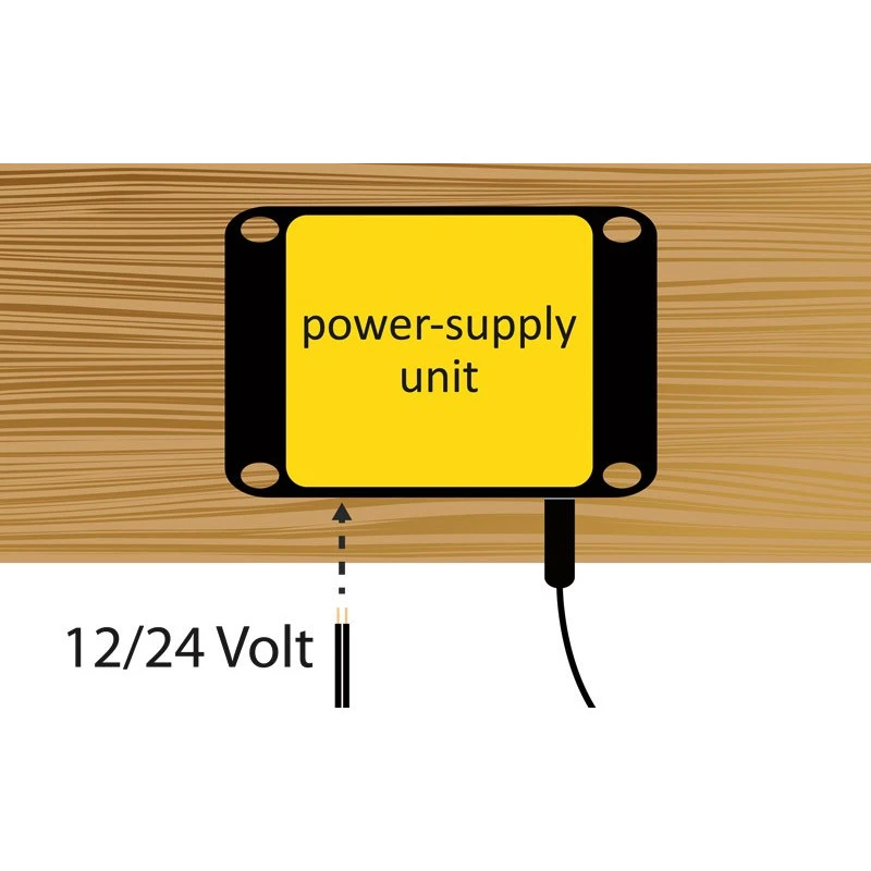 Fixer avec 2 vis (fournies) la lampe dans le coffre à gaz. Amener le câble d’alimentation (3m) à l’intérieur du véhicule et le raccorder au bloc d’alimentation 4,5 V. Pour finir, brancher au câble 12V ou 24V du véhicule.