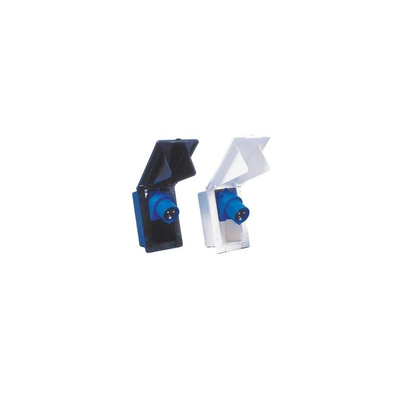 Equipement électrique du bateau ou camping-car, socle encastré noir ou blanc avec fiche mâle P17 3 plots avec couvercle de protection.