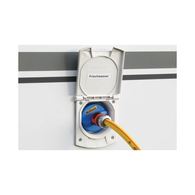 Très pratique, cet accessoire pour camping-car et fourgon aménagé s’installe sur les coupelles de remplissage HEOSOLUTION et permet de connecter un tuyau d’arrosage grâce au raccord rapide.