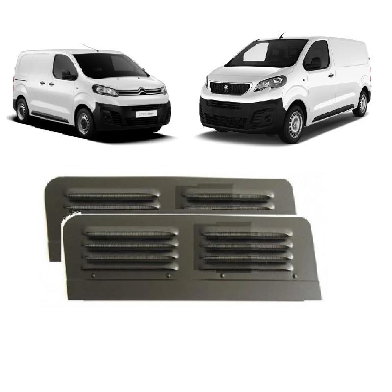 Paire de grille de ventilation à poser sur les fenêtres latérales avant des fourgons aménagés Citroen Jumpy et Peugeot Expert. Permet de ventiler l’intérieur en sécurité.