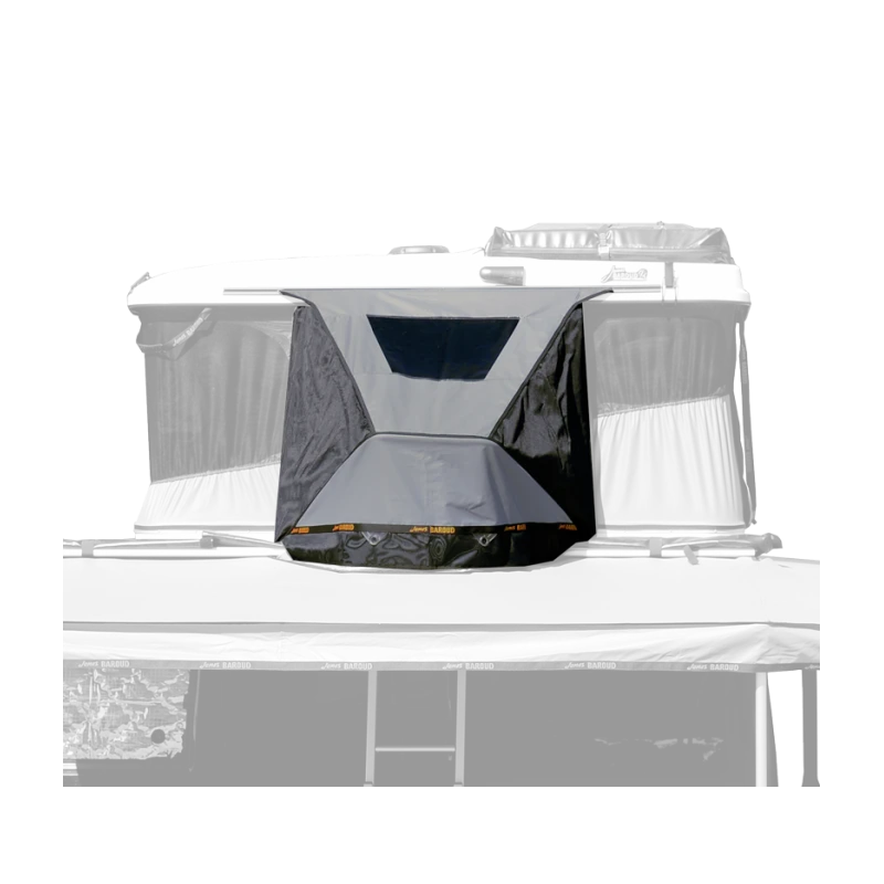 Tunnel de la marque JAMES BAROUD, cet accessoire optionnel est idéal pour faire un sas entre l’extérieur et l’intérieur de votre tente de toit, posée sur votre van aménagé.