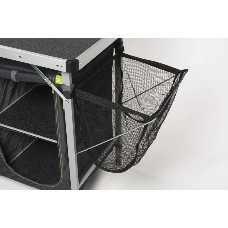 Ce meuble de camping est très bien conçu et regroupe tous les avantages des autres meubles de cuisine habituels en 1 ! Vous disposez d’éléments qui vous permettrons de ranger, de cuisiner et d’organiser votre coin cuisine comme à la maison et ce sans prendre de place sous l’auvent de votre caravane. Cet unité de cuisine comprend donc un meuble de cuisine avec étagères, une poubelle sur le côté droit, des crochets de suspensions sur le côté gauche pour vos serviettes et torchons, un plan de travail pour réchaud ou barbecue gaz, un évier encastré et un espace de rangement supérieur pour stocker vos épices et autres condiments.