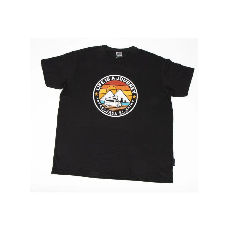 Superbe t-shirt de la marque Life Is A Journey aux couleurs ensoleillées représentant un fourgon aménagé. Le t-shirt noir aux motifs colorés est un cadeau sympa pour les vanlifers !