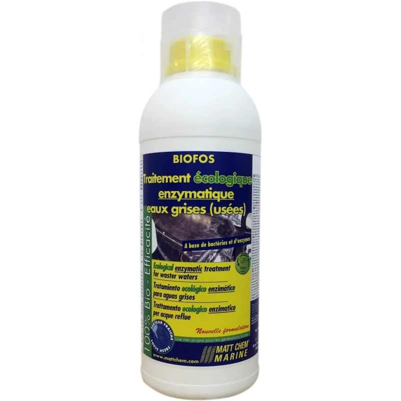 Traitement à base de bactéries et d’enzymes et dégraisse et élimine les dépôts dans les réservoirs d’eaux usées et noires dans les bateaux ou camping-cars, le MATT CHEM Biofos est 100% écologique.