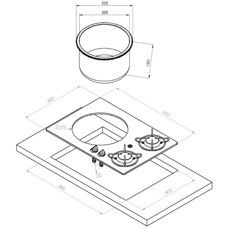 - Dimensions interne évier : 300 x P180 mm (évier fixe et collé au plan de cuisson)