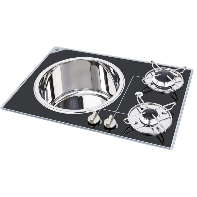 Réchaud gaz cristal 2 feux combiné à un évier inox rond poli miroir, du plus belle effet ce réchaud assemblé sur plaque de verre est parfait pour concevoir un coin cuisine compacte dans le bateau ou le fourgon aménagé.