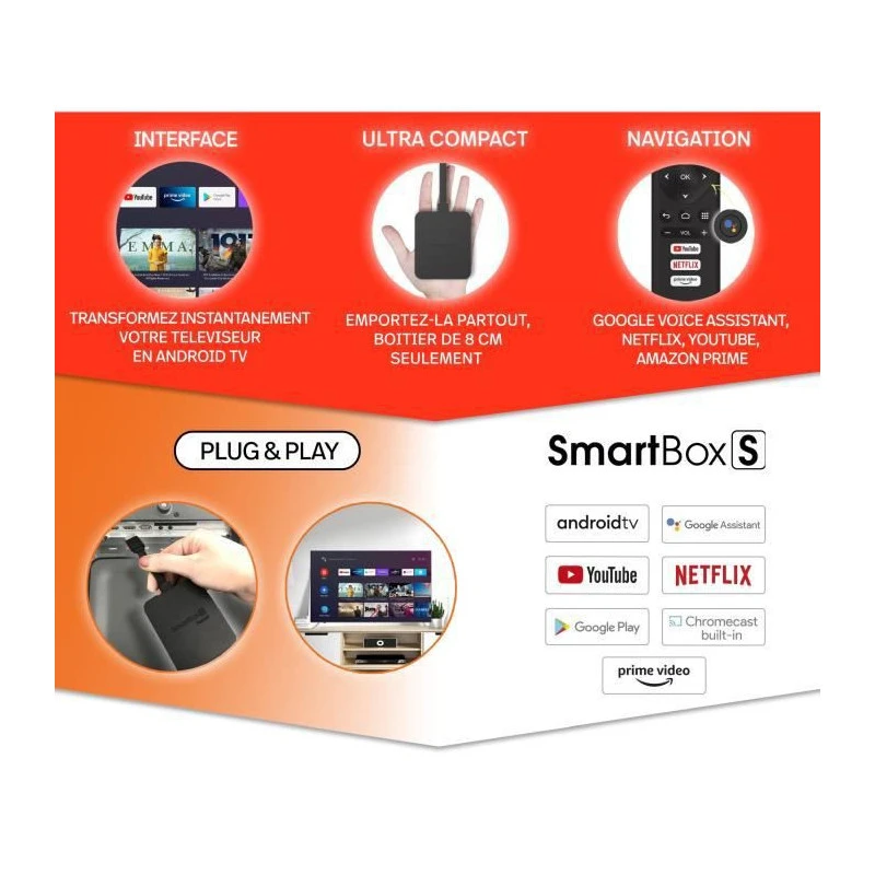 Parfait pour actualiser votre téléviseur, le module POLAROID est constitué d’un boitier ainsi que d’une télécommande. Le but de la SmartBox S est de convertir votre ancien téléviseur en un téléviseur doté des applications de streaming.