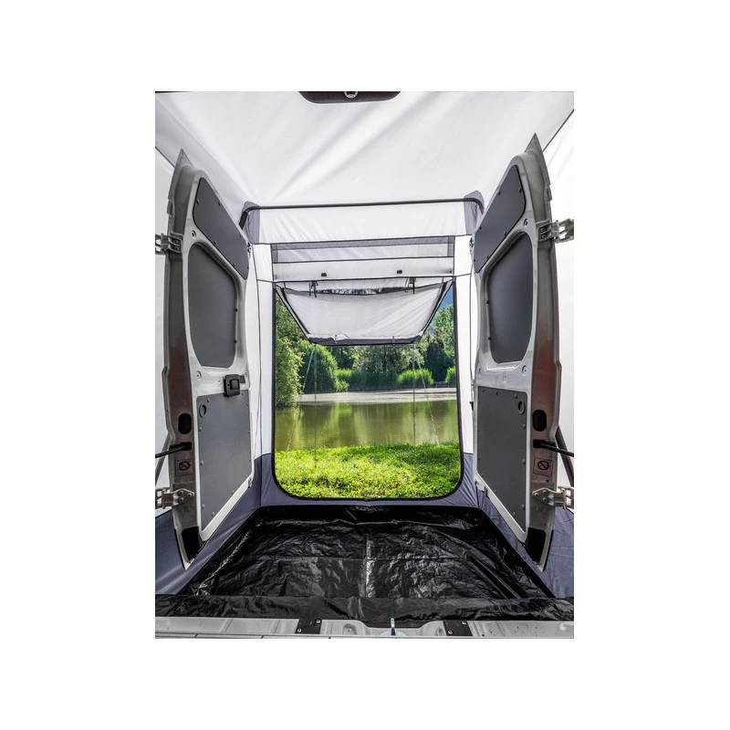 Le sas arrière Ducatissimo Prenium est une tente/sas arrière en toile à fixer sur les portes arrières des fourgons aménagés FIAT Ducato, Boxer, Jumper. Cette toile permet une extension pratique et rapide lors des arrêts prolongés en camping-car.