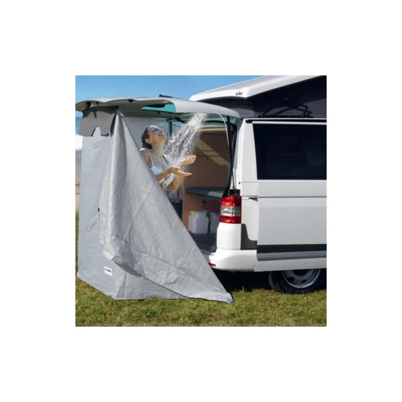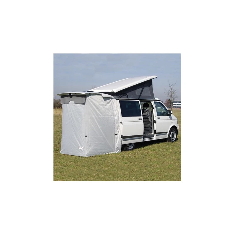Auvent/sas pour fourgon aménagé type VW T5/T6 avec hayon. Permet d’augmenter l’espace de vie ou de créer une cabine de douche.