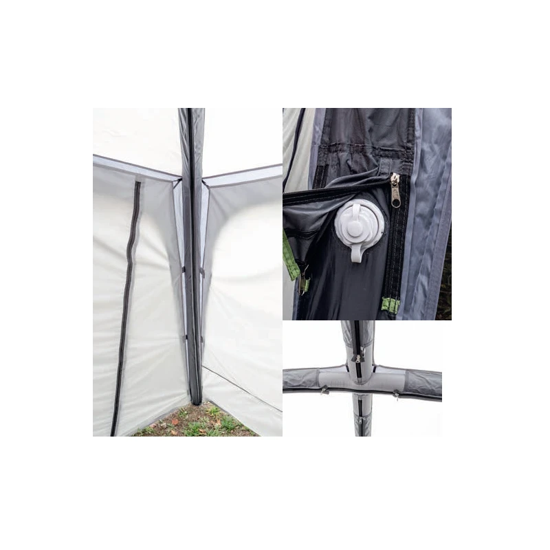 La tonnelle Linosa 350 de chez REIMO est pourvu d’arceaux gonflables qui se mettent en place facilement et rapidement. Cet abri est indépendant et se dispose sur votre zone de campement à l’aide du système d’haubanage fourni.