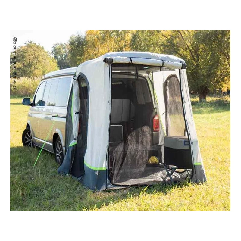 Parfait pour augmenter l’espace de vie lors de vos weekends et vacances découvertes en fourgon aménagé, cet accessoire vient se fixer sur le hayon des VW T5 et T6 pour faire un sas transformant l’arrière du van en une véritable pièce de vie supplémentaire ! Facile à mettre en place et à enlever, la tente de hayon Uprgade Premium de REIMO offre des options supplémentaires que les autres auvent n’offrent pas. Notamment un tapis de sol inclus avec trois portes à moustiquaire pour dormir à l’abris des nuisibles !