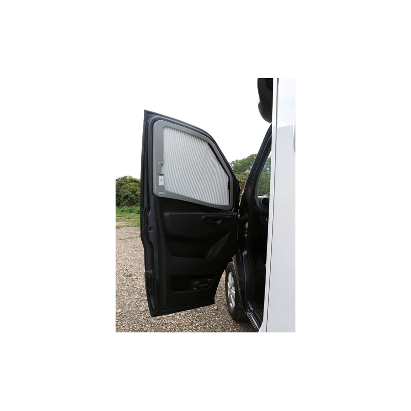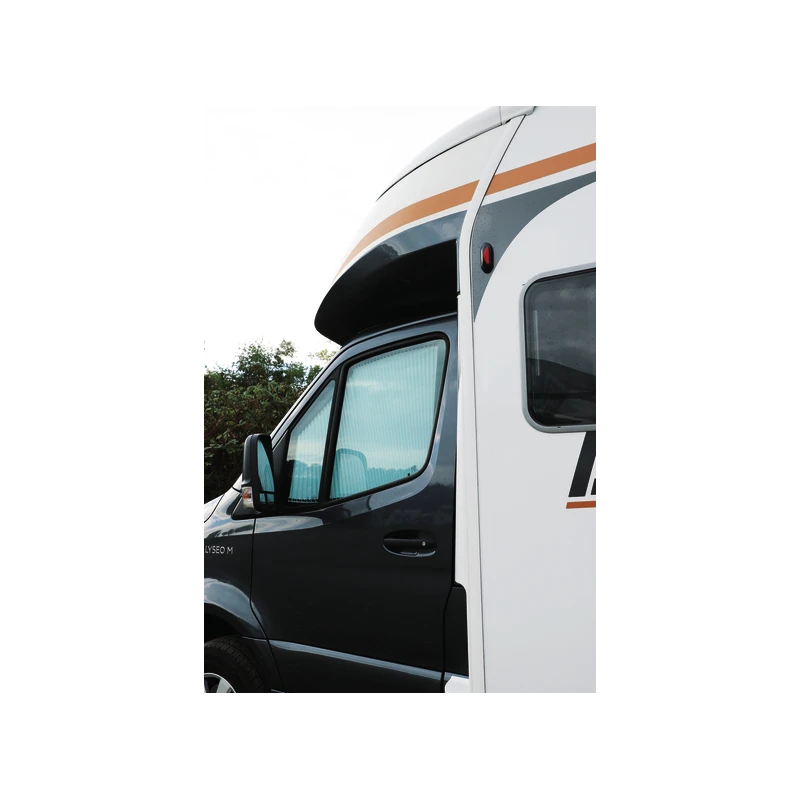 Conçu spécialement pour les Mercedes Sprinter, pour les versions camping-cars & fourgons aménagés depuis 2019, le rideau extérieur de camping-car occultant & isolant vient se fixer sur les montants du véhicule. Le store reste donc constamment en position rangé dans ses montants sans gêner la vue du conducteur ou du copilote.