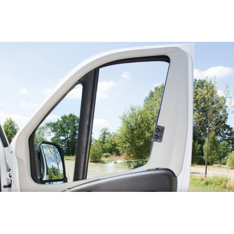 Conçu spécialement pour les camping-cars & fourgons aménagés de marque : Fiat Ducato, Peugeot Boxer & Citroëm Jumper X90 entre 2014 & 2020, le store type rideau isolant RemiFront 4 vient se fixer sur les montants du véhicule. Il reste constamment en position ranger dans ses montants sans gêner la vue du conducteur ou copilote.