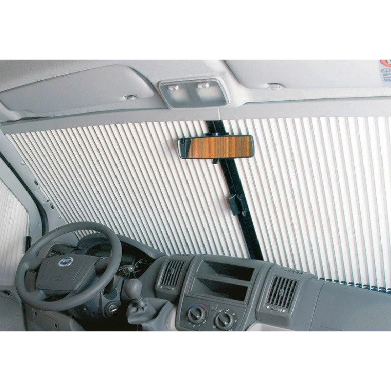 Le store type rideau isolant REMI Front 4 vient se fixer sur les montants du véhicule, le store reste constamment en position ranger dans ses montants sans gêner la vue du conducteur.