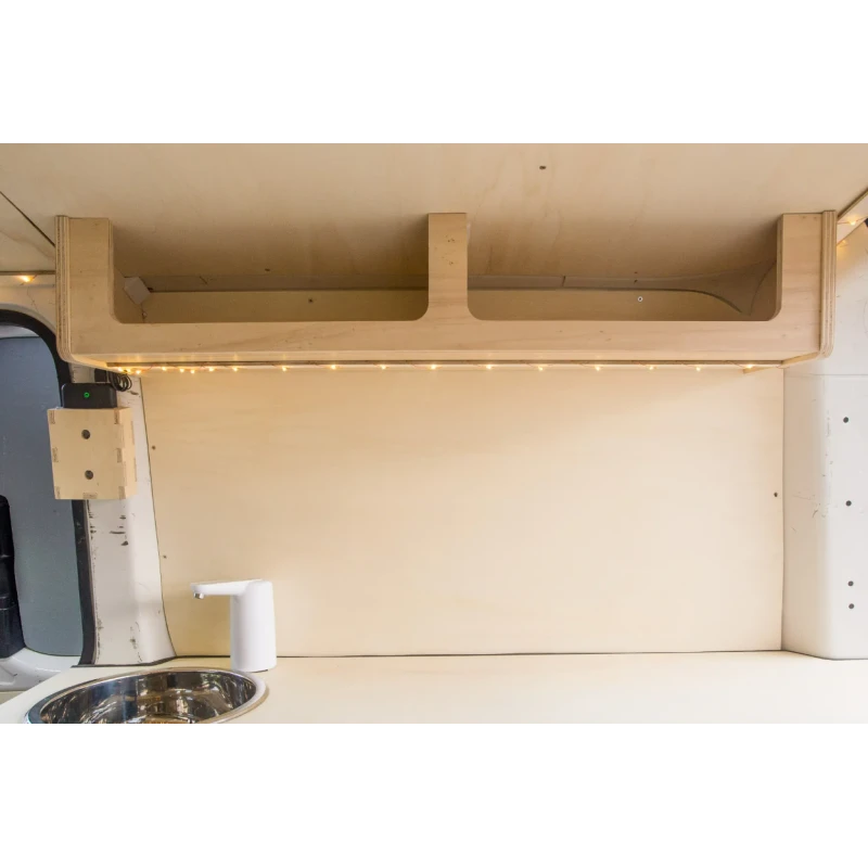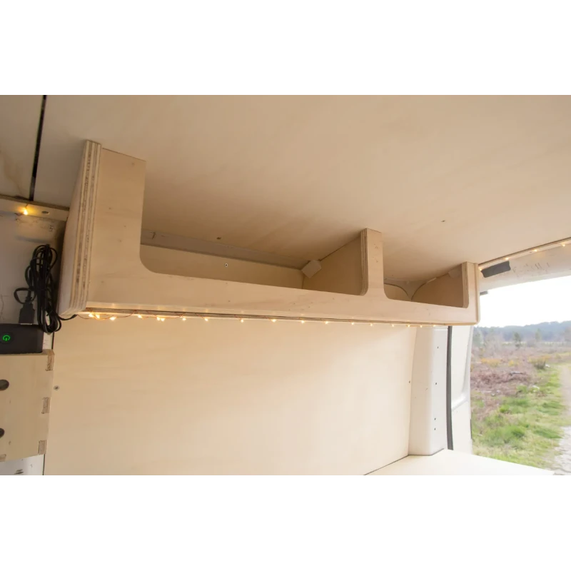 Le meuble haut SIMPLE VANS est spécialement conçu pour les vans compacts comme par exemple : Opel Vivaro, Renaud Trafic 3, Ford Custom ou encore Volkswagen T6.1 etc… Cette étagère se place en hauteur contre les parois latérales arrières de votre fourgon pour améliorer votre confort de vie et ainsi augmenter vos espaces de rangement pour vos vêtements, vos livres, votre vaisselle etc…