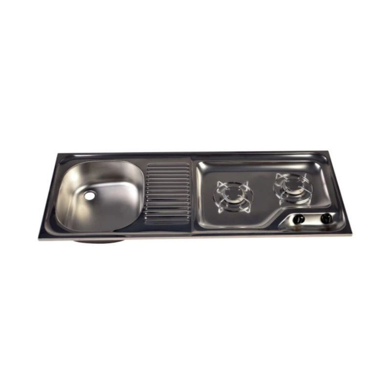 Grand combiné en inox SUTER plan de cuisson 2 réchauds gaz avec un évier à égouttoir dédié pour l’aménagement de la cuisine de votre van, fourgon aménagé ou camping-car. Dimensions de 1050 x 420 mm, alimentation gaz butane, propane et GPL.