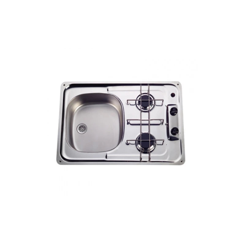 Equipement pour l’aménagement de la cuisine des fourgons aménagés et bateaux combiné SUTER inox plan de cuisson 2 réchaud gaz avec évier grandes dimensions.