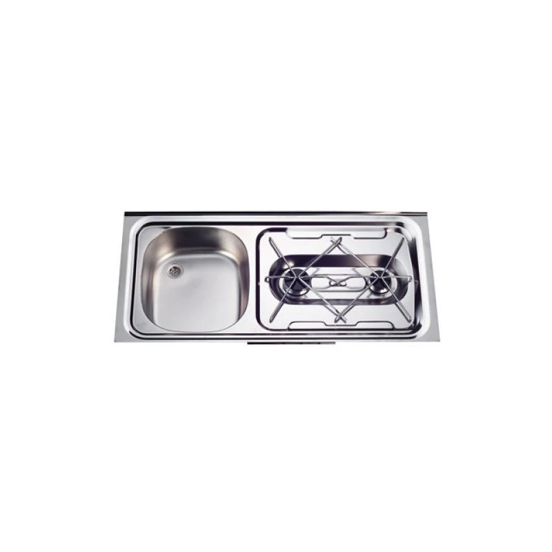 Combiné en acier inox de 900 x 420 mm de SUTER comprenant un évier (cuve) et un réchaud gaz à 2 feux pour l’aménagement de votre van, fourgon ou camping-car. Installation par encastrement sur le plan de travail.