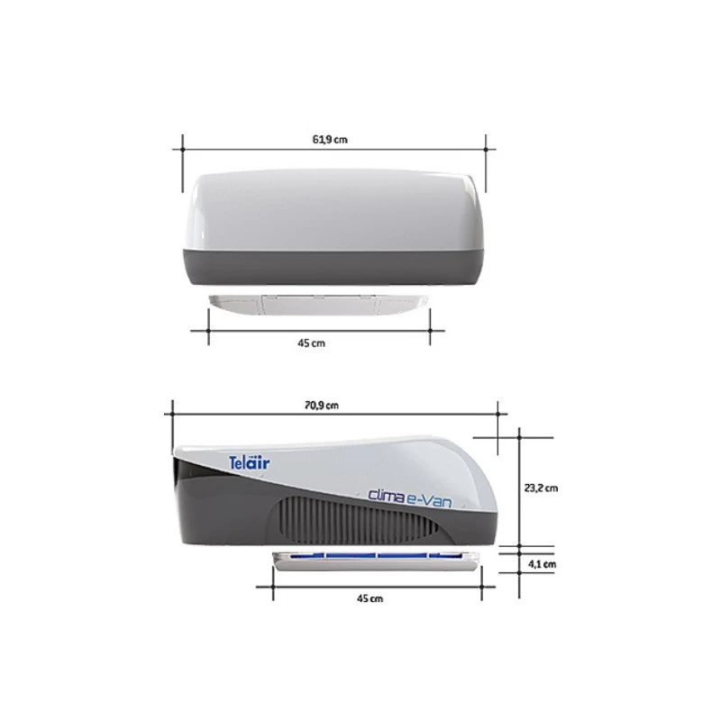 La gamme Clima e-Van de TELAIR offre tous les avantages d’une climatisation de toit « classique » mais offre des dimensions plus compactes que les climatiseurs traditionnels que l’on trouve sur les fourgons ou les camping-cars. Grâce à son bloc compact sur le toit (71 x H 23 cm), ce modèle est donc tout spécialement conçu pour les fourgons aménagés et camping-car compacts.