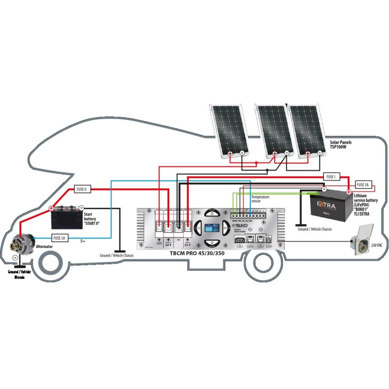 Le TBCM PRO 45/30/350 Multicharger de TELECO est un combiné multifonctions chargeur booster DC/DC 12V avec entrée panneau solaire et chargeur 230V 30A pour charger la batterie cellule de votre camping-car, van ou fourgon aménagé.