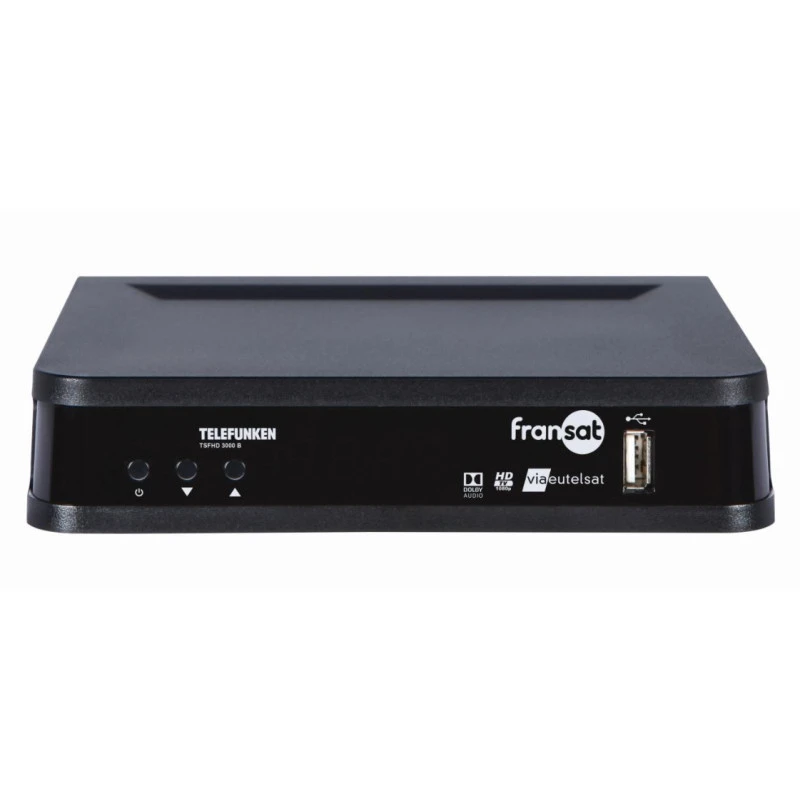 TELEFUNKEN Démodulateur FRANSAT HD, décodeur né du fabriquant Allemand pour la réception de la TNT par satellite en haute définition, équipé du dernier tuner numérique HD ce démodulateur 12V avec IR déporté est conçu pour la réception du bouquet TNT gratuit FRANSAT via le satellite, livré avec sa carte FRANSAT.