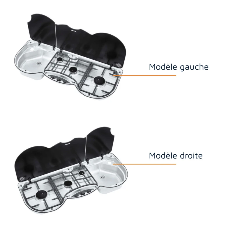 Découvrez le THETFORD 353 ! Ce combiné évier et plaque de cuisson 3 feux ultra-pratique se décline en 2 versions : évier à gauche ou à droite.