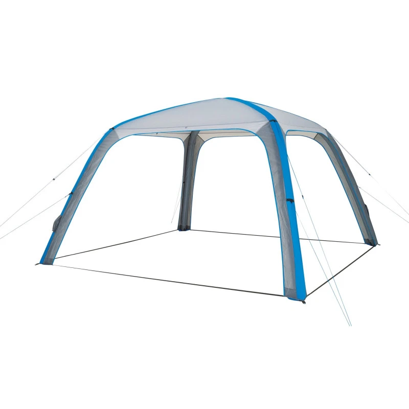 Abri tonnelle avec armature gonflable possédant 4 murs amovibles pour aménager un repas à l’extérieur en camping tout en étant à l’abri.