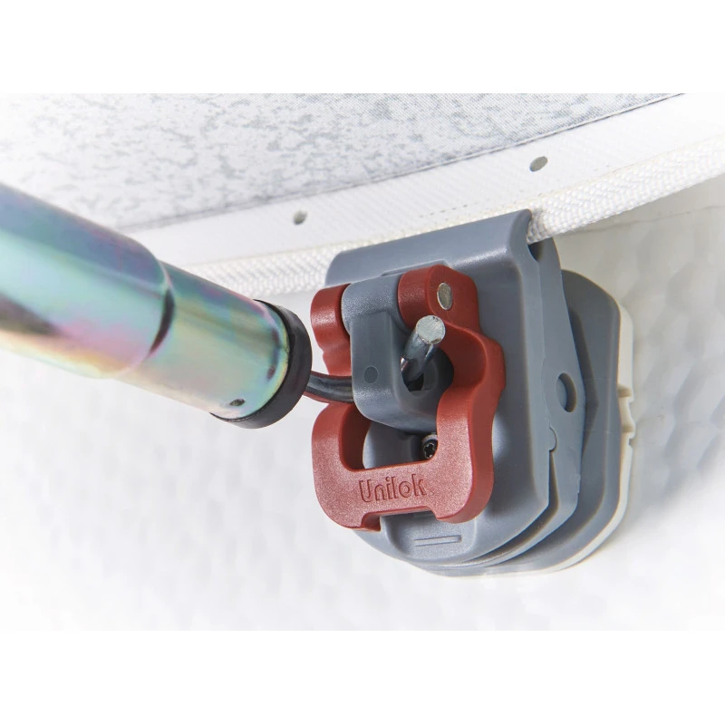 – Sangles tempêtes : 2 sangles réglables et amovibles fixées au sol par piquets acier, prolongés avec ressorts