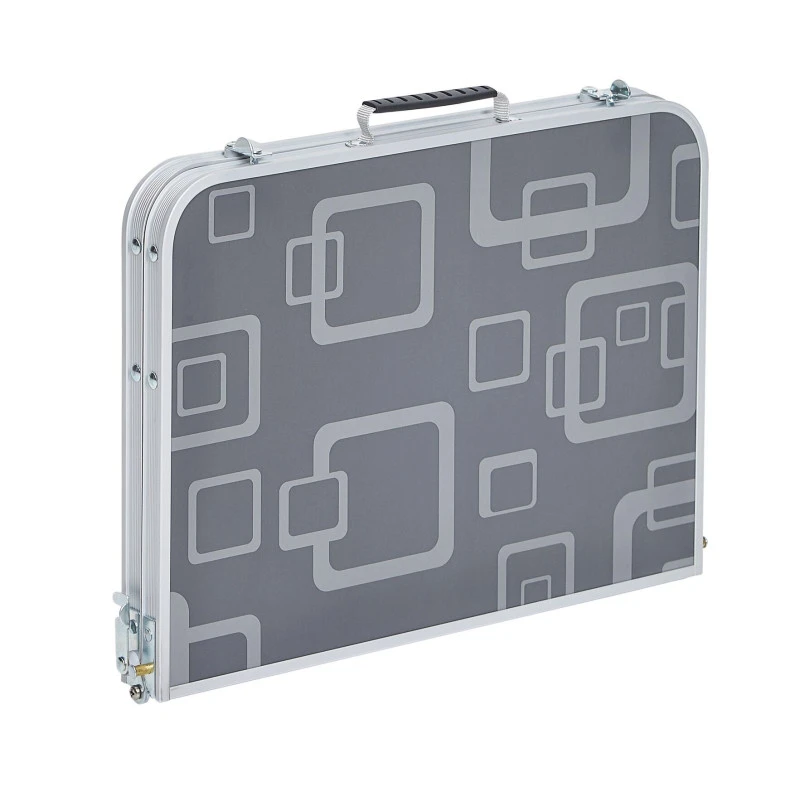 Cette petite table parfaite pour 2 personnes est repliable pour se refermer en forme de valise et est transportable très facilement grâce à sa poignée de transport. Un loquet de verrouillage se trouver sur le côté pour assurer la liaison et la rigidité des 2 plateaux une fois dépliés. Ses pieds à l’intérieur du plateau se déplient et son maintenues par un système d’équerres qui assurent la stabilité de votre table valise.