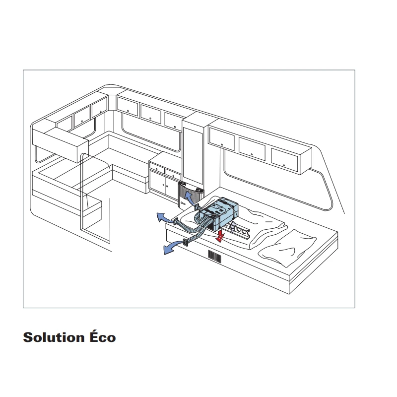 - Solution Eco : Les bouches de sorties sont installés en positions basses, à cotés du climatiseur TRUMA Saphir. Cela permet de ne pas avoir besoin de tirer de gaines sur la hauteur du véhicule. TRUMA propose le kit de montage EasySet pour faciliter ce montage. Cette solution est particulièrement adaptée pour une installation sur un aménagement existant, sans passage prévue pour les gaines d’air froid. Neanmoins, l’air froid se diffusera moins bien & les performances seront amoindris.
